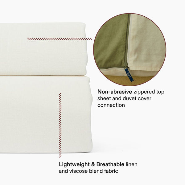 Featuring the Align System, our patented, first-of-its-kind attachable Duvet Cover and Top Sheet puts an end to tangling with messy sheets. Made from a linen viscose blend.